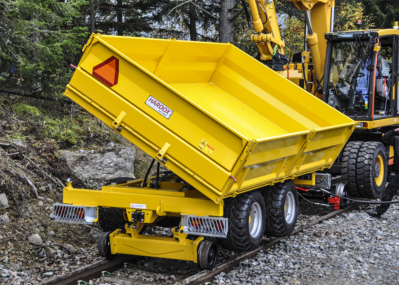 Der Anhänger kann leicht umgerüstet werden, um nach rechts, links und hinten zu kippen, und der Kippwinkel kann so eingestellt werden, dass er den maximalen Höhen auf bestimmten Baustellen entspricht. Der Anhänger wurde für einen einfachen Anschluss an die Trägermaschine konstruiert und verfügt über ein eigenes Fernsteuerungssystem, das es ermöglicht, alle Funktionen vom Fahrerhaus aus zu manövrieren. Die Schienenachsen können einzeln manövriert werden, haben Park-/Notbremsen und eine Achse kann zur Erhöhung der Sicherheit schwenken. Die hydraulische Deichsel kann nach oben und unten verstellt werden, um den Ein- und Ausstieg von der Strecke zu erleichtern.