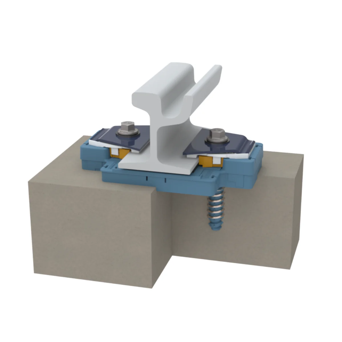 The system, when installed in concrete, provides support to all sides of the rail and allows stringent vertical and lateral support criteria to be met, and at the same time offers vibratory and electrical decoupling from its surroundings.