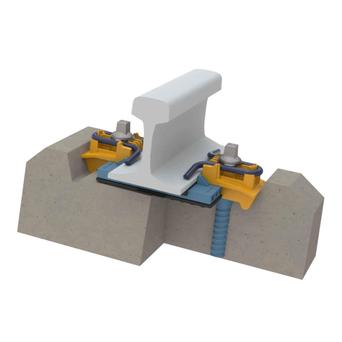 SD-HSS is designed for high speed lines on precast concrete slab tracks, offering high levels of attenuation and electrical insulation. This durable and reliable threaded fastening solution has been developed to fit in W shaped rail seats. SD-HSS can deliver higher rates of construction thanks to its efficient controlled clip guidance from ‘parked’ to the ‘in-service’ position. The system is characterised by a compact and robust design with a lower carbon footprint. Its optimised geometry also enables automatic installation, resulting in improved efficiency and cost savings during installation and maintenance.