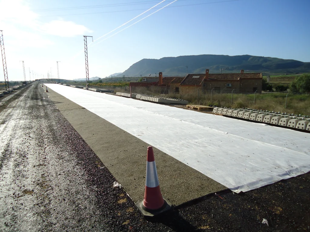 A non-woven geotextile protection layer is used to protect mats against ballast stone penetration. In addition, the geotextile protects joints between the mats and acts as a filter for small particulates while retaining water permeability.